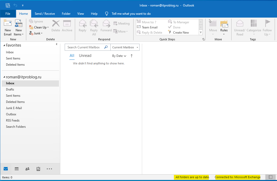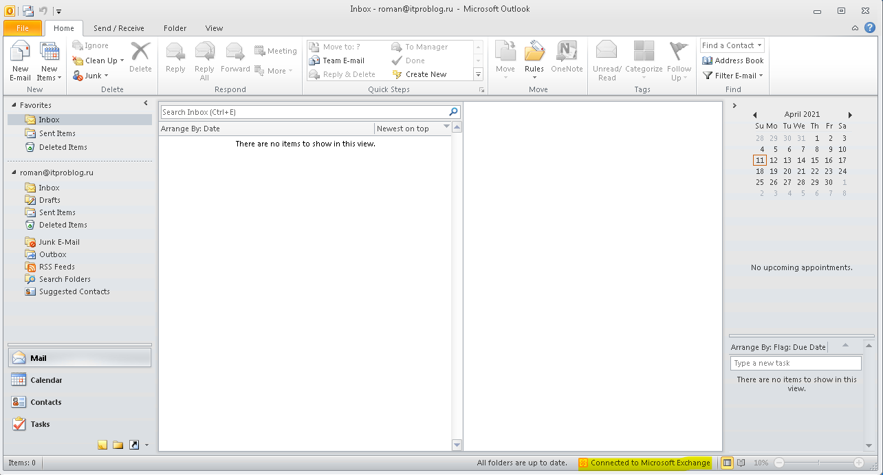 Теперь, когда у нас практически подготовлена исходная инфраструктура Exchange 2010 мы можем подключиться к нашему пока единственному почтовому ящику через Outlook: