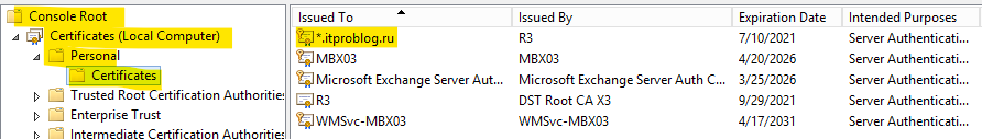1. Запустить MMC консоль управления сертификатами для локального компьютера на первом сервер Exchange 2016: