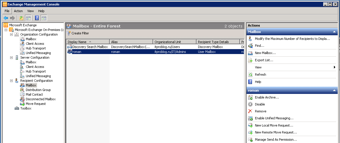 Для начала рассмотрим сценарий тестового окружения. У меня есть сервер почтовых ящиков MBX1, который разбит следующим образом: