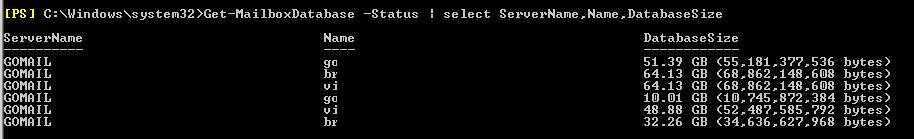 Get-MailboxDatabase -Status | select ServerName,Name,DatabaseSize