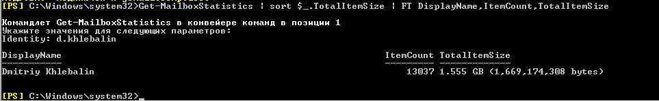 Например посмотреть размер ящика одного пользователя можно и через графический интерфейс и через Power Shell.