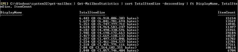 get-mailbox | Get-MailboxStatistics | sort TotalItemSize -descending | ft DisplayName, TotalItemSize, ItemCount