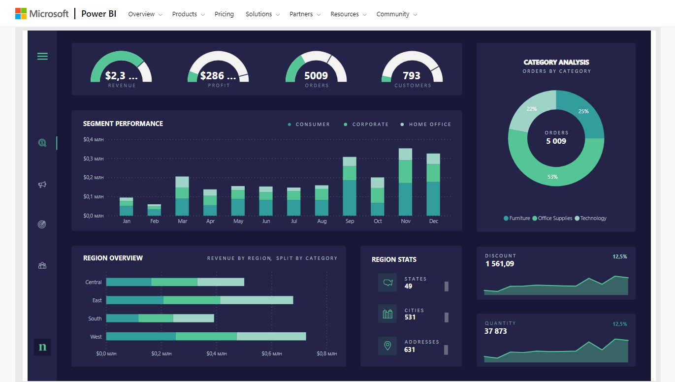 - Веб-сайт Power BI: это веб-платформа для просмотра приложений или решений Power BI и обмена ими. Используя веб-сайт Power BI, вы можете создавать информационные панели из отчетов, делиться информационными панелями с другими пользователями Power BI, а также фрагментировать данные в отчете.
