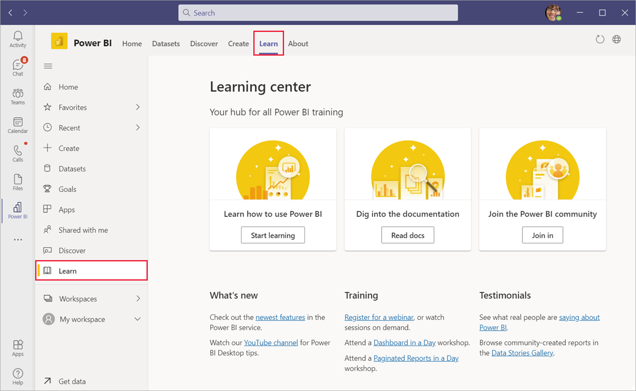 Приложение Power BI в Microsoft Teams также включает в себя центр для обучения. Щелкните Обучение, чтобы открыть Центр обучения.