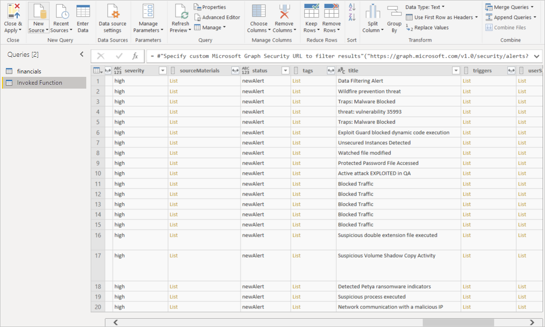 Теперь вы можете использовать импортированные данные из соединителя Microsoft Graph Security в Power BI Desktop. Вы можете создавать графики и отчеты. Вы также можете взаимодействовать с другими данными, импортированными из книг Excel, баз данных или других источников данных.