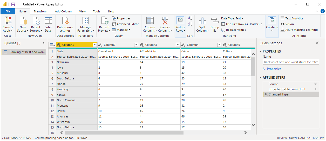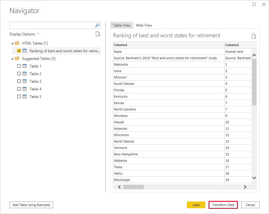 Функция запроса Power BI Desktop активируется и обратится к веб-ресурсу. В окне Навигатор отображается найденное на веб-странице. В данном случае это HTML-таблица Ranking of best and worst states for retirement (Рейтинг лучших и худших штатов для пенсионеров) и пять других рекомендуемых таблиц. Вас интересует HTML-таблица, поэтому выберите ее, чтобы выполнить предварительный просмотр.