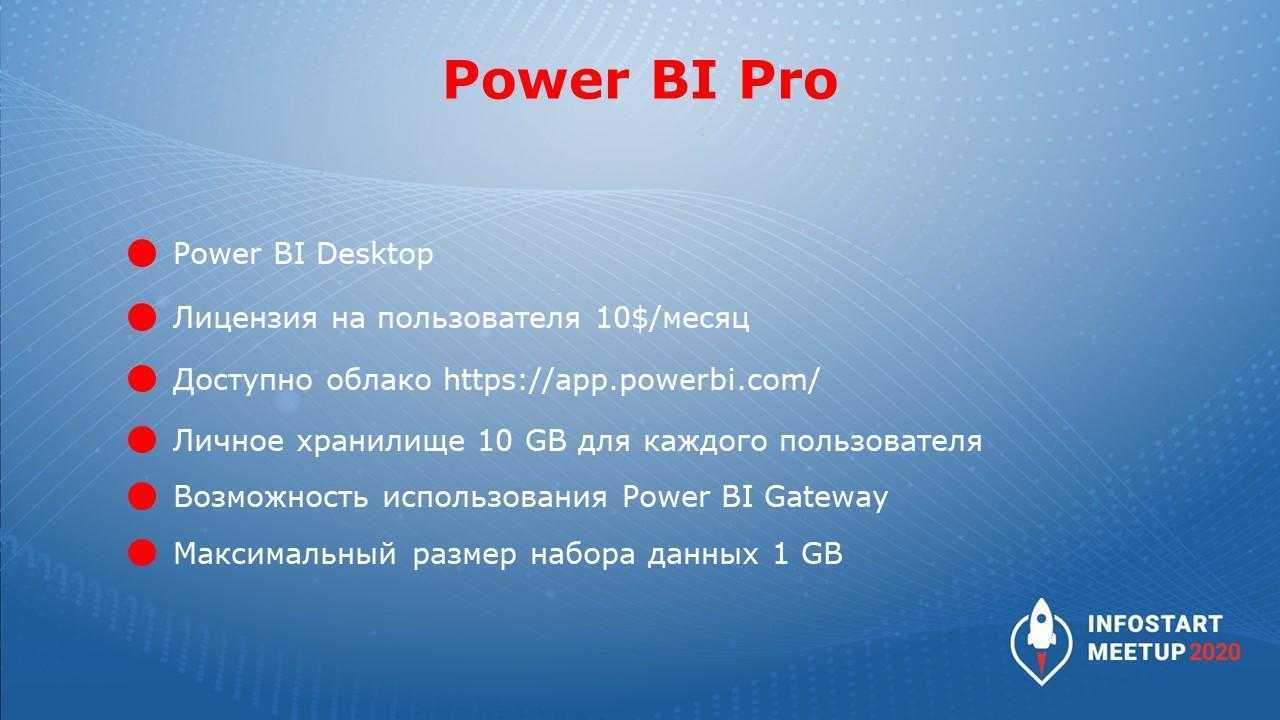 Стоимость лицензии Power BI Pro – это 10$ в месяц, но в каждой стране цена отличается. В России может быть дешевле, в Европе – чуть дороже. В конце доклада я расскажу о способах минимизации. Там есть очень интересные факторы – сколько стоят экзамены, сколько стоят различные подписки.