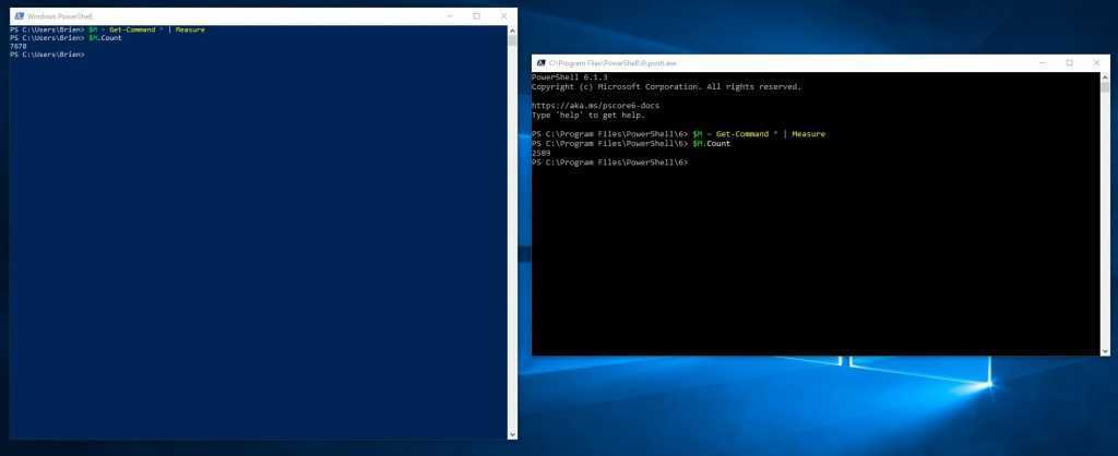 If you look at the screenshot below, you can see that PowerShell currently includes 7,678 cmdlets. On the other hand, PowerShell Core includes only 2,589 cmdlets. Keep in mind that this figure is based on the modules that are currently loaded, but both environments were running the same three modules (Microsoft.PowerShell.Management, Microsoft.PowerShell.Utility, and PSReadLine).