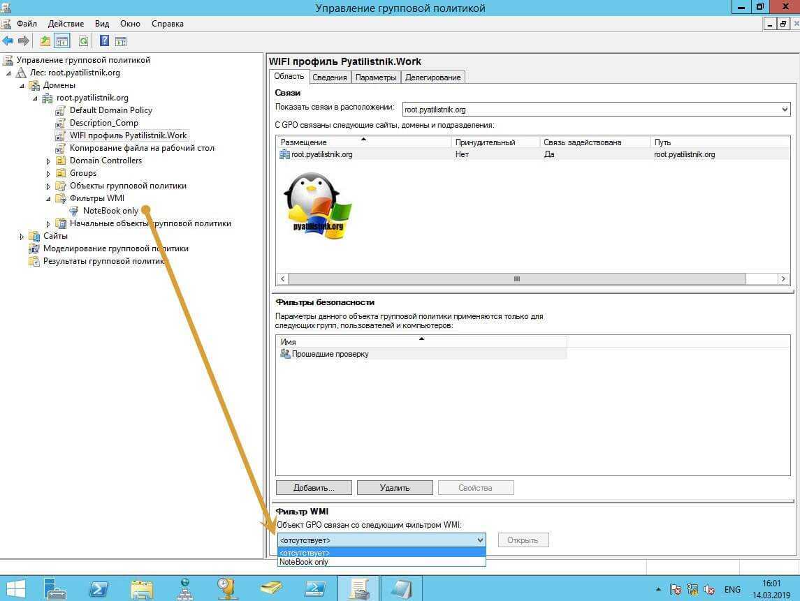 Для этого в самом низу в пункте «Объект GPO связан со следующим фильтром WMI» и из всплывающего списка выберите созданный ранее фильтр.