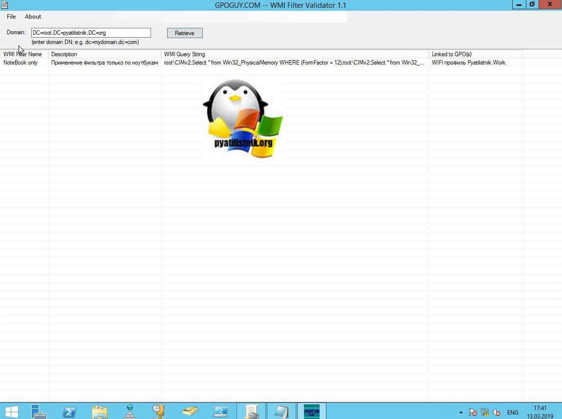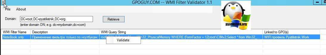 У вас откроется интерфейс WMI Filter Validation Utility. Чтобы получить все текущие фильтры WMI, вам необходимо нажать кнопку «Retrieve». В моем примете в списке появилась одна записи. Вы увидите имя фильтра, его описание, сам WQL запрос и применен ли он к политике, в моем случае да, под названием «WIFI профиль Pyatilistnik.Work».