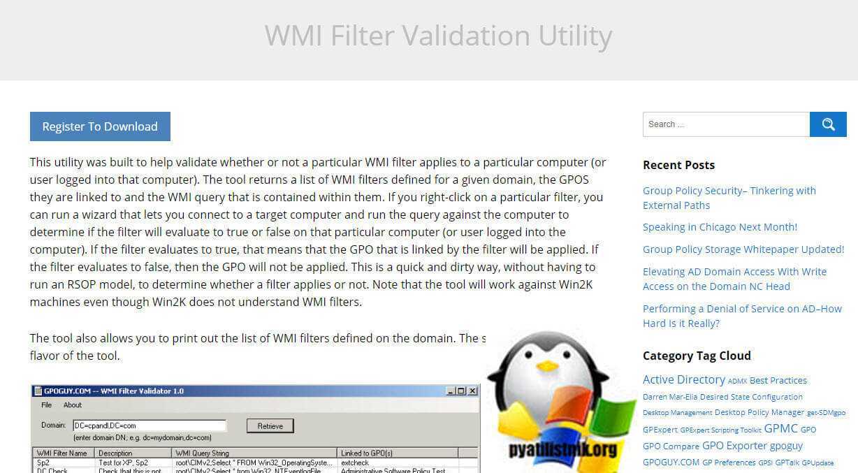 WMI Filter Validation Utility — Эта утилита была создана, чтобы помочь проверить, применяется ли определенный фильтр WMI к определенному компьютеру (или пользователю, вошедшему в систему на этом компьютере). Инструмент возвращает список фильтров WMI, определенных для данного домена, GPO, с которой они связаны, и запрос WMI, содержащийся в них. Если вы щелкнете правой кнопкой мыши по определенному фильтру, вы можете запустить мастер, который позволит вам подключиться к целевому компьютеру и выполнить запрос к компьютеру, чтобы определить, будет ли фильтр иметь значение true или false на этом конкретном компьютере (или пользователя вошедшего в систему). Если значение фильтра равно true, это означает, что объект групповой политики, связанный с этим фильтром, будет применен. Если фильтр оценивается как ложный, объект групповой политики не будет применяться. Это быстрый и простой способ, без необходимости запуска модели RSOP, определить применяется ли фильтр или нет. Инструмент также позволяет распечатывать список фильтров WMI, определенных в домене.