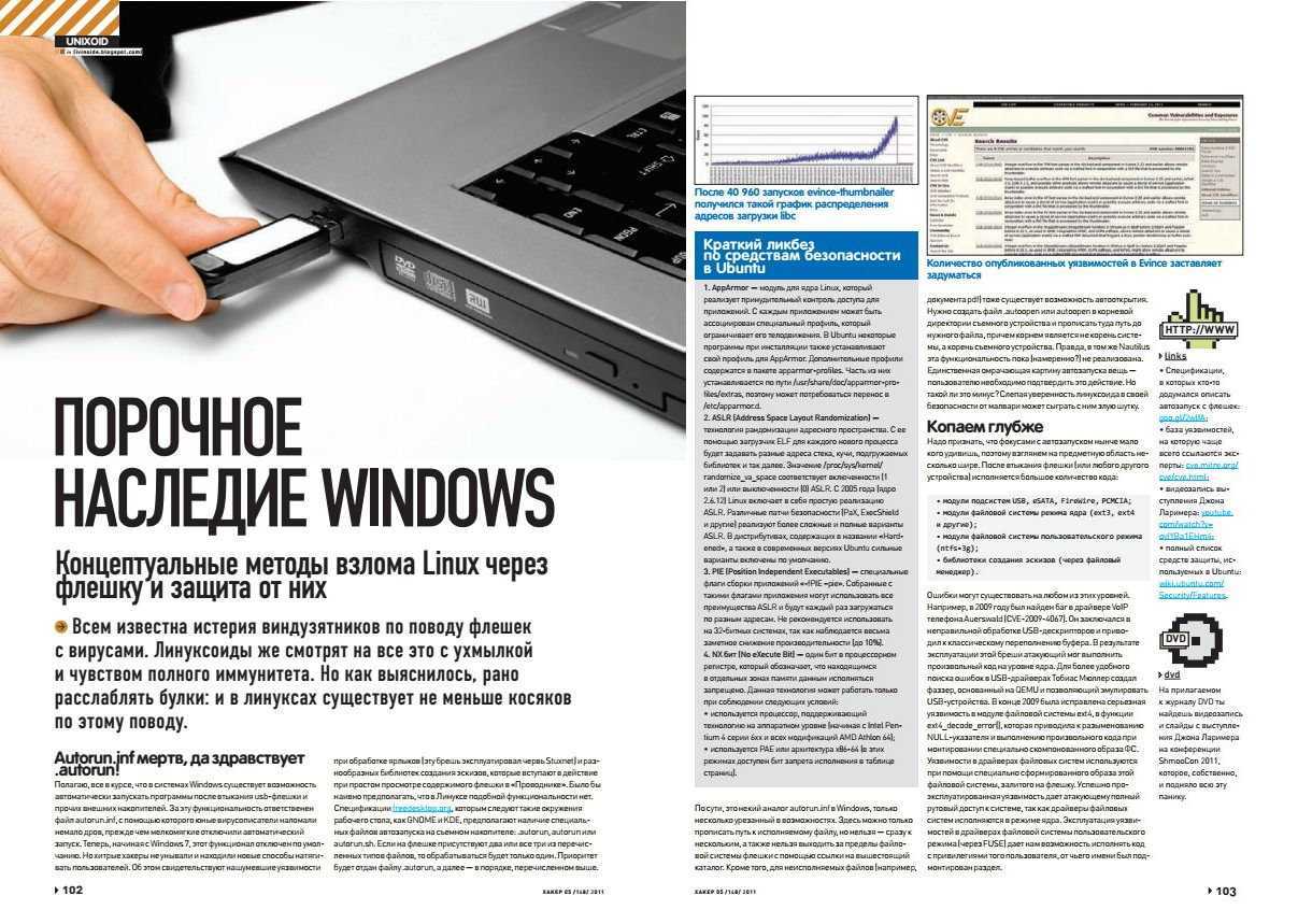 Какой юзер Windows не помнит траблы с флешками и надоедливым вирусом из Autorun? Пользователи Linux всегда смотрели на эту проблему свысока, мол, их это не касается. Отчасти это так, но не все столь гладко, как хотелось бы. У пингвина были свои проблемы — это .autorun, аналогичный по функциональности, брешь Adobe Acrobat Reader со шрифтами, в результате которой в Nautilus’е можно запустить что угодно, косячные драйверы, некорректно обрабатывающие съемные носители, и фичи, позволяющие обойти такие механизмы безопасности, как AppArmor, ASLR, PIE и NX-биты. Уже интересно? Тогда читай материал, и ты узнаешь, как это было.