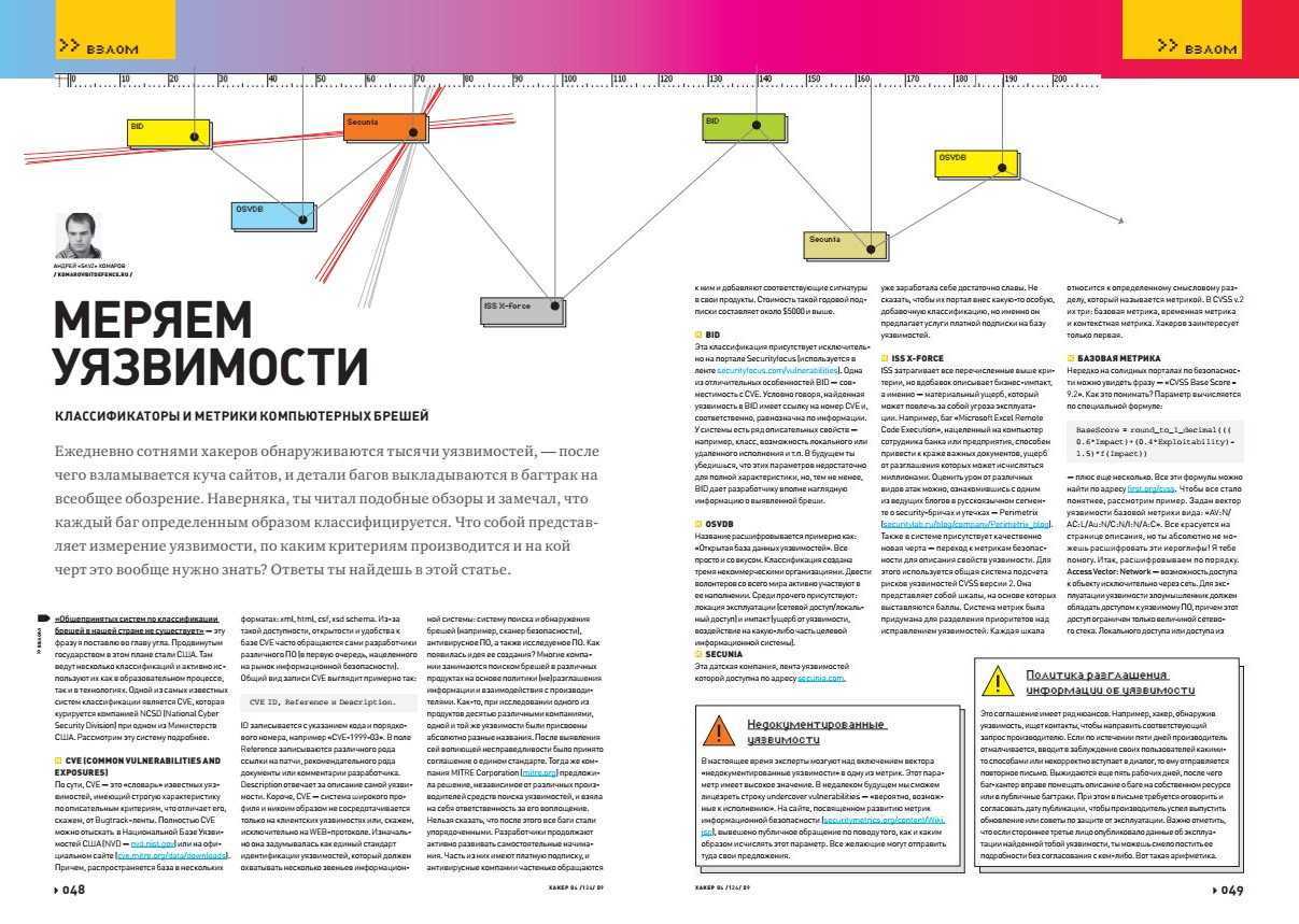 Последнее время все чаще и чаще слышишь фразы: «Там уязвимость, тут уязвимость, в этом софте нашли брешь, в том сервисе дырка». И на каждую такую уязвимость выходит бюллетень, описывающий саму проблему, рекомендации разработчиков и другие меры, которые можно принять для собственной защиты. Вся эта информация публикуется на баг-треках, специальных сайтах, собирающих информацию об уязвимостях. Любой может ознакомиться с этой информацией, а более предприимчивые на черном рынке всегда могут купить эксплоит под данную уязвимость или готовый инструмент для атаки. Когда ты читал подобные обзоры, наверняка замечал, что каждый баг определенным образом классифицируется. Что собой представляет «измерение уязвимости», по каким критериям оно производится и зачем это вообще нужно знать? Ответы ты найдешь в этой статье.
