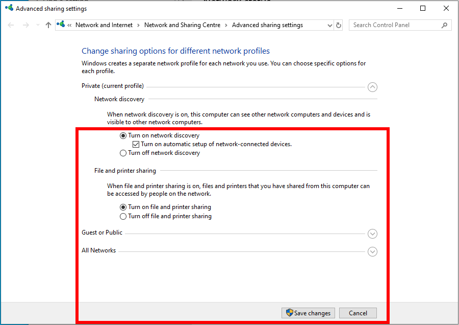 Then Turn on network discovery and Turn on file and printer sharing and Save changes: