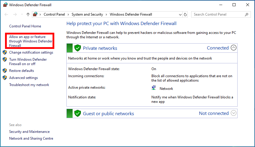 In the tab ‘Allow an app or feature through Windows Defender Firewall’