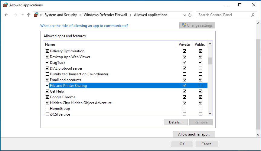 найдите «Общий доступ к файлам и принтерам» и убедитесь, что стоит галочка в столбце «Частная» — если его там нет, то нажмите кнопку «Изменить параметры», поставьте галочку и нажмите ОК.