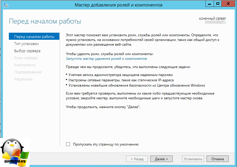 У вас откроется мастер добавления ролей и компонентов, на первом окне можете ничего не читать, там одна вода, жмем далее.