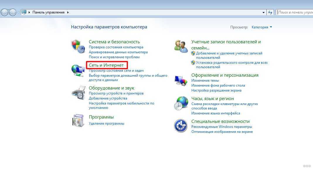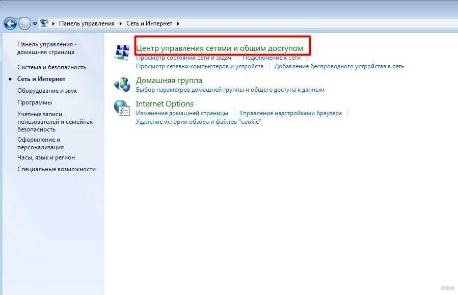 - Выберите категорию «Центр управления сетями и общим доступом».
