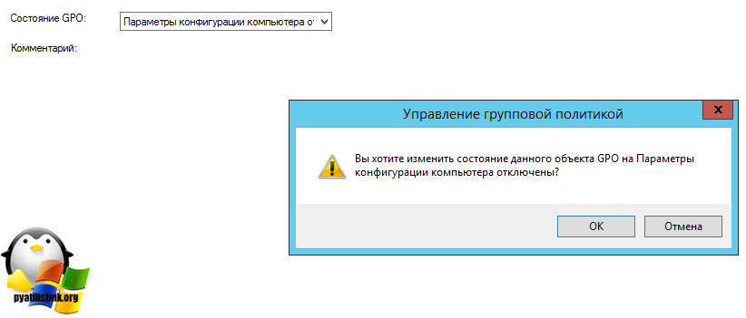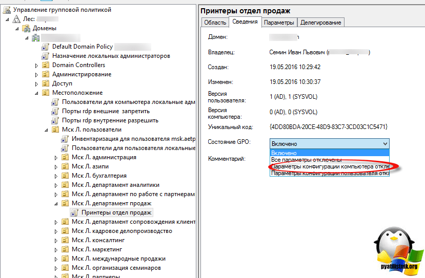 Еще небольшой тюнинг увеличивающий скорость обработки применения групповой политики. Выберите политику и перейдите на вкладку Сведения, щелкните Состояние GPO и выберите отключить Параметры конфигурации компьютера откл, так как у нас развертывание идет на пользователя, если бы было развертывание на компьютер, то мы бы отключили применение для пользователя. Этим действием вы увеличите скорость обработки ее по сети.