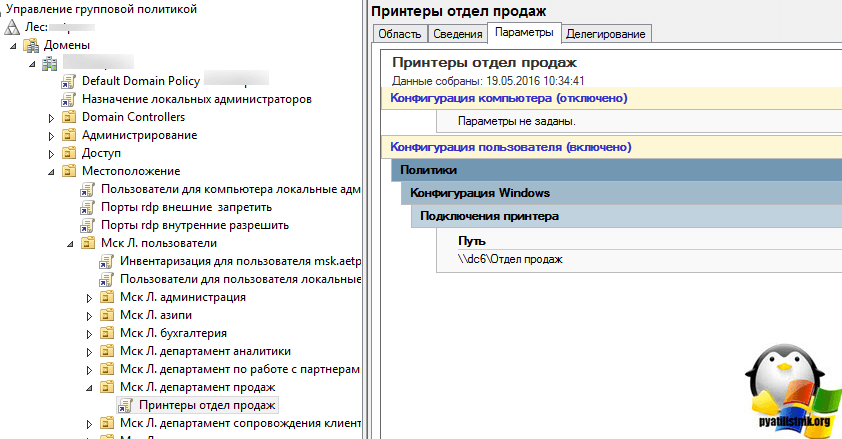 Если посмотреть параметры gpo, то увидим unc путь до нашего принтера на сервере печати.