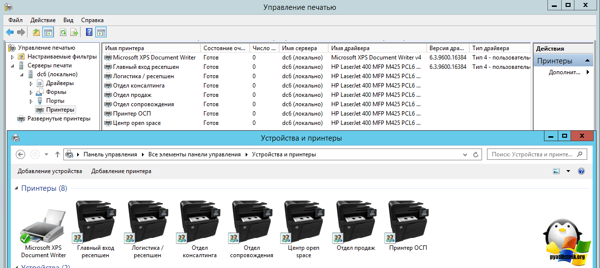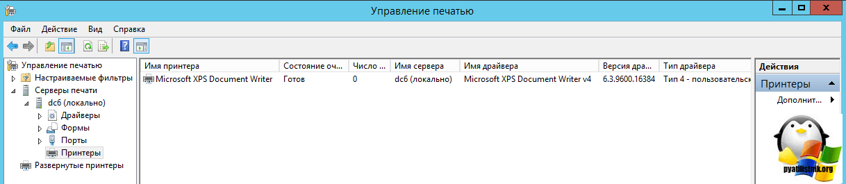 Продолжаем делать наш сервер печати windows server 2012. В открывшейся оснастке mmc откройте Серверы печати > далее ваш > Принтеры. Как видите у вас только стандартный Microsoft XPS принтер. Логично, что вам нужно поставить все ваши сетевые принтеры. У меня в сети настроена пачка сетевых принтеров HP LaserJet 400 MFP M425dn
