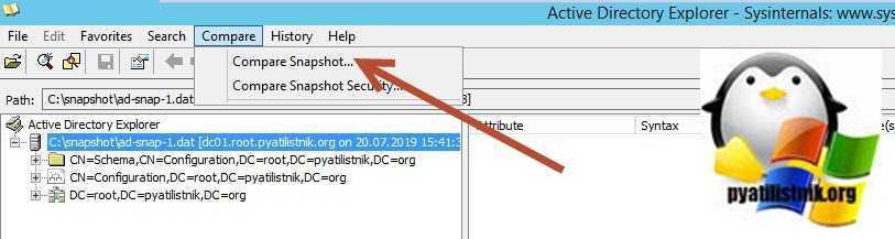 Это на мой взгляд самый удобный из бесплатных инструментов, по просмотру атрибутов вашего AD. Запускаем утилиту, для того чтобы создать новый снапшот, вам нужно выбрать раздел контекста именования имен, после чего открыть меню «File» и выбрать там пункт «Create Snapshot».