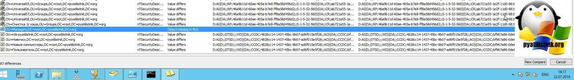 На выходе вы получите сводный список с подробной картой изменений. Так например мы видим, OU Managers, и у нее статус, что она отсутствует на первом снимке (Object missing in first).