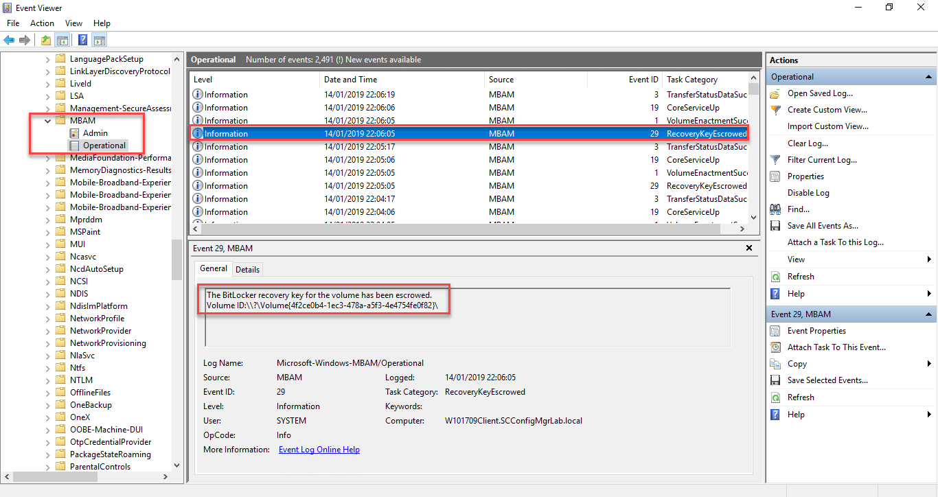 The MBAM service provides event logs so you can see what is taking place, these are located in the following location – Application and Services Logs\Microsoft\Windows\MBAM. In the below example you can see an entry showing that the key was escrowed as part of a recovery event;