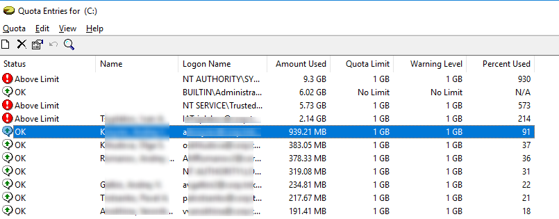 По умолчанию для всех пользователей устанавливаются одинаковые квоты. Из окна Quota Entries вы можете создать, увеличить или отключить стандартную квоту для конкретного пользователя.
