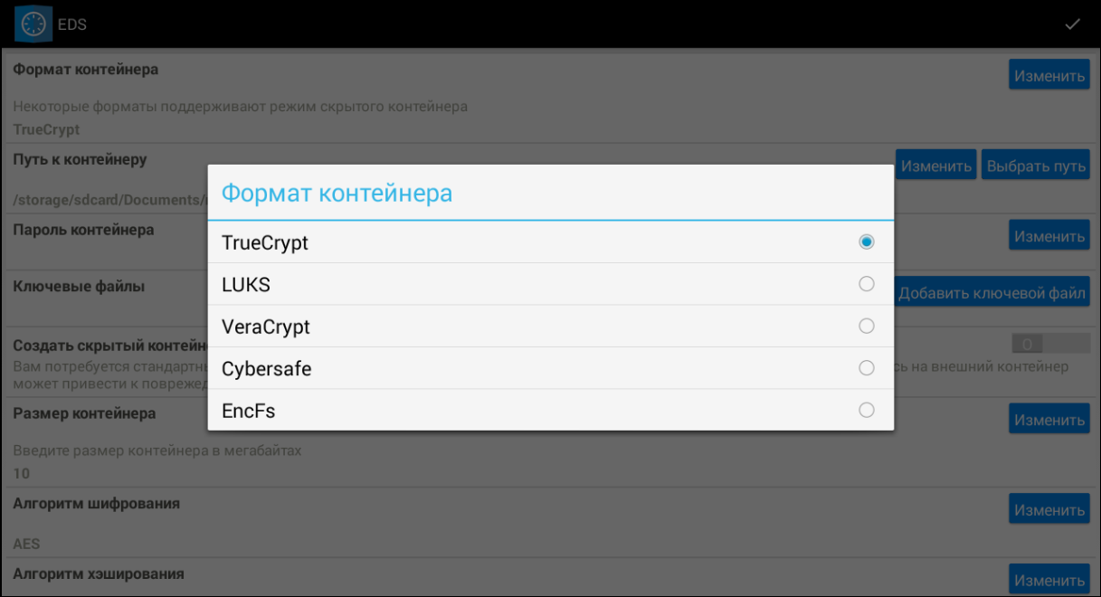 Официального клиента под Android для VeraCrypt нет и не планируется, однако его авторы рекомендуют использовать приложение EDS (Encrypted Data Store). Это российская разработка, существующая в полнофункциональном и облегченном варианте. Полная версия EDS стоит 329 рублей. Она поддерживает криптоконтейнеры формата TrueCrypt, VeraCrypt, CyberSafe, а также LUKS и EncFS. Умеет работать с локальными, сетевыми и облачными хранилищами, обеспечивая другим приложениям прозрачное шифрование. Шифрование на лету требует поддержки ядром ОС фреймворка FUSE и прав рут. Обычная работа с криптоконтейнерами возможна на любых прошивках.
