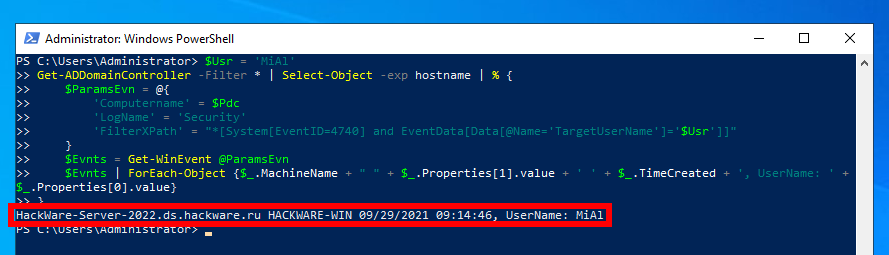 Как с помощью PowerShell найти компьютер на котором была заблокирована учётная запись