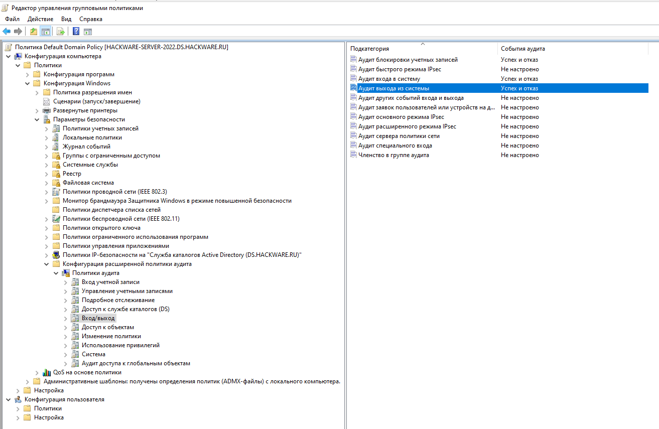 В русскоязычной версии это соответственно Конфигурация компьютера → Политики → Конфигурация Windows → Параметры безопасности → Конфигурация расширенной политики аудита → Политика аудита → Вход/Выход, политики: