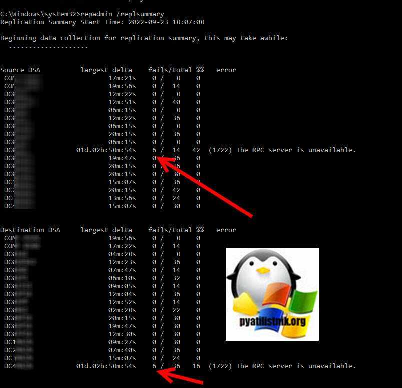 Данная команда показывает все ошибки репликации на предприятии. Вот как выглядит ошибка: