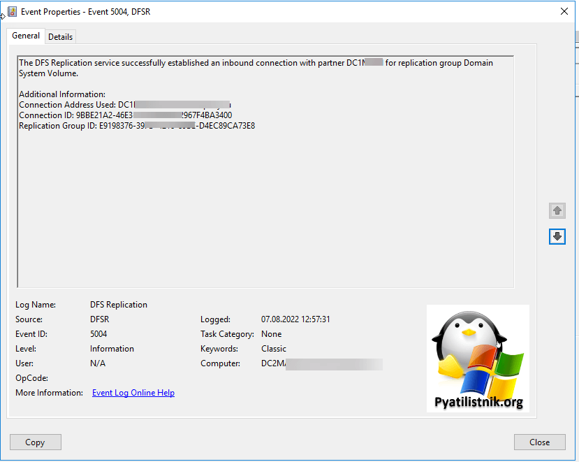ID 5004: The DFS Replication service successfully established an inbound connection with partner DC1 for replication group Domain System Volume.