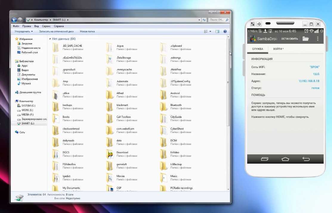 Выбрав папку на компьютере и смартфоне при наличии беспроводной связи можно получить доступ к файлам, находящимся в ней, как при загрузке с ПК, так и при помещении их туда с телефона.