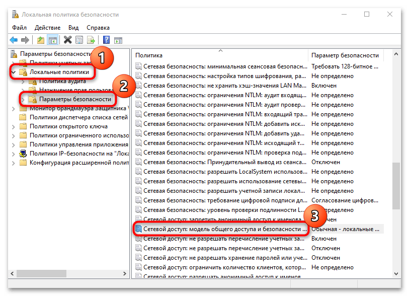 Раскройте каталог «Локальные политики», затем выделите папку «Параметры безопасности». В списке отыщите параметр «Сетевой доступ: модель общего доступа и безопасности». Дважды щелкните по нему.