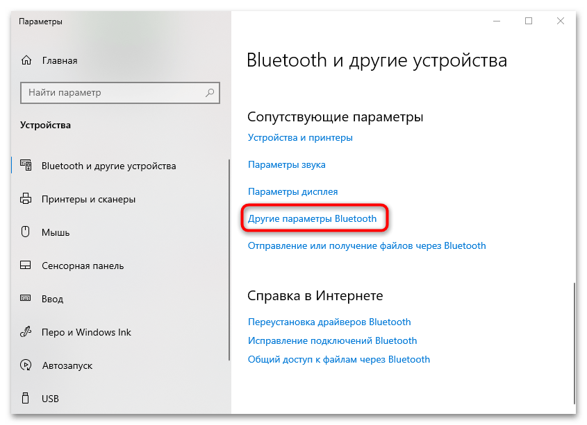 Пролистайте окно вниз и выберите ссылку «Другие параметры Bluetooth».
