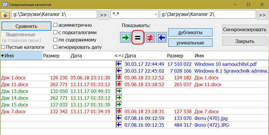 • Отличающихся файлов на любой из панелей – кнопки с зелёной стрелкой вправо и синей влево;• Разных редакций – кнопка с красным перечёркнутым знаком равенства;• Идентичных данных, включая их разные редакции – кнопка «Дубликаты»;• Всех отличающихся файлов, оставив на обозрение только те, что с идентичными названиями, хотя и с разными редакциями – кнопка «Уникальные».