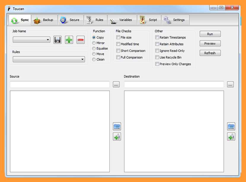 Toucan — это небольшая утилита, позволяющая синхронизировать, выполнять резервное копирование и обеспечивать безопасность данных с большим количеством опций, чем встроенные утилиты пакета. Она разделена на 7 вкладок, что позволяет легко найти нужную функцию. В этой версии доступны все функции: