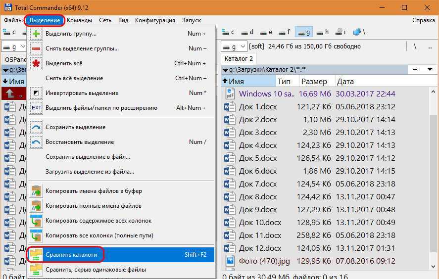 Функция сравнения каталогов позволяет выявлять отличающиеся файлы в одностороннем порядке. Её можно использовать для поддержания в актуальном состоянии содержимого только одной из папок. Например, когда нужно на компьютер переместить фото с флешки, фотоаппарата, смартфона или прочего гаджета, при этом нет надобности захламлять фотографиями компьютера подключённое устройство. В таком случае в окне файлового менеджера ставим курсор на панель той папки, из которой должны быть скопированы обновлённые данные. И в меню «Выделение» выбираем «Сравнить каталоги».