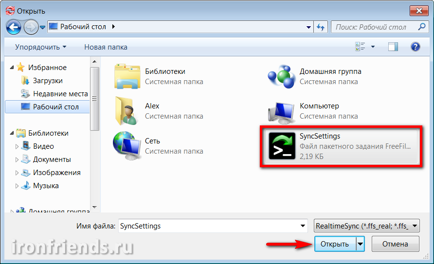 Откройте утилиту с помощью ярлыка RealTimeSync на рабочем столе или в меню «ПУСК», зайдите в меню «Файл» и выберите «Открыть».