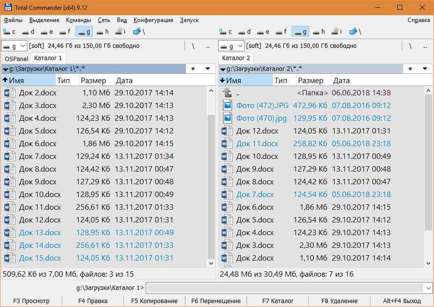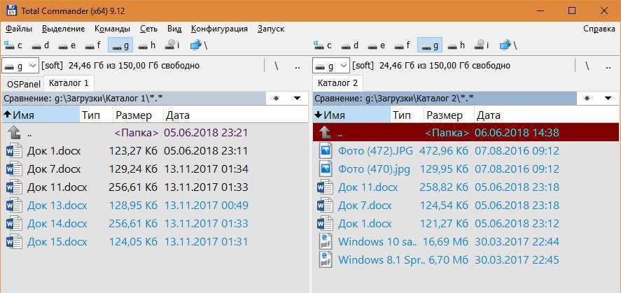 После чего на обоих панелях увидим все отличающиеся файлы — с другими именами, а также обновлённые редакции с теми же именами, но с разной датой редактирования и иным весом. Они будут отмечены другим цветом, цветом выделения, настроенным в теме оформления Total Commander. В нашем случае это синий цвет текста. Старые редакции данных не отмечаются выделением.