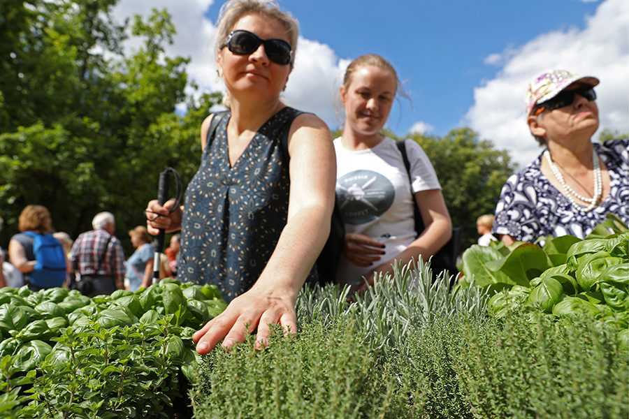 В зеленом пространстве продуман каждый шаг: вдоль пешеходных дорожек из плитки, камня и террасной доски установлены скамейки для отдыха, а на пересечении основных аллей обустроена беседка для мастер-классов. Клумбы-цветники имеют разную высоту, чтобы людям на инвалидных колясках или с очень слабым зрением было удобно рассматривать растения. Цветы для тактильного сада ботаники из Общества охраны природы тоже подбирали особенные ─ ярких цветов и с характерными запахами (слабовидящие люди лучше всего различают контрастные композиции).