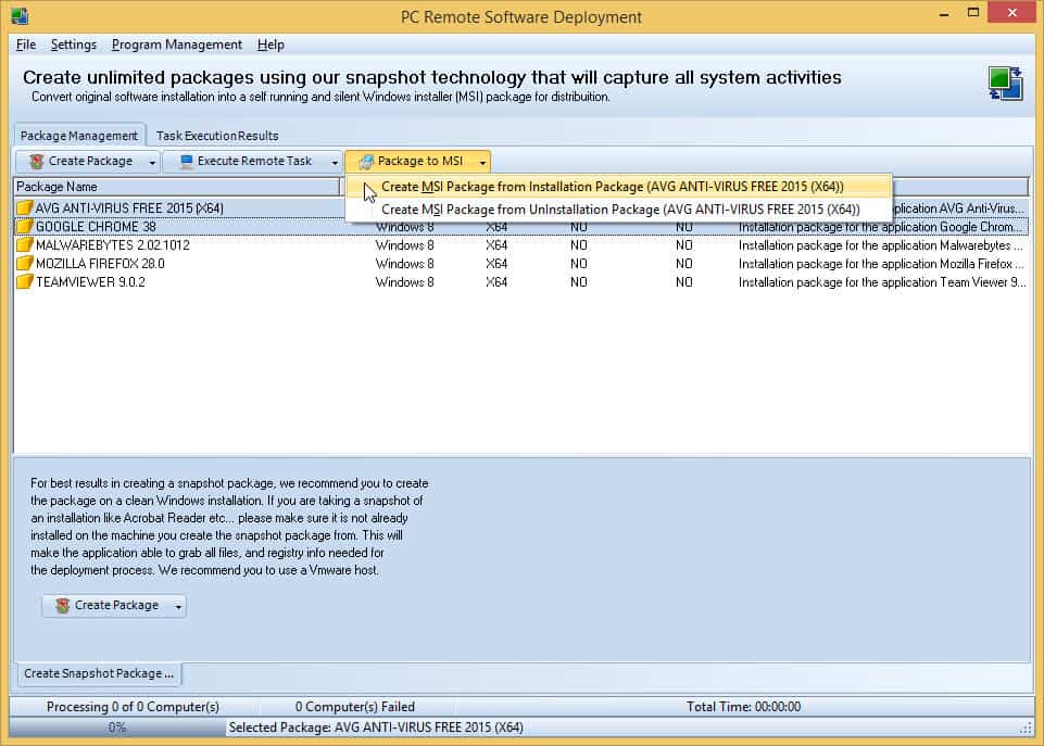 Наиболее уникальным аспектом удаленного развертывания программного обеспечения является то, что он позволяет пользователям преобразовывать установщики EXE в файлы MSI со снимками своих систем. Снимок системы фиксирует всю необходимую файловую систему или данные реестра для установщика MSI. Это программное обеспечение не ограничивается только установщиками, так как вы также можете настроить пакеты удаления. Это приложение также позволяет пользователям автоматизировать развертывание программного обеспечения на удаленных компьютерах.