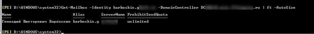Get-Mailbox -Identity barboskin.g@pyatilistnik.org -DomainController DC4.root.pyatilistnik.org | ft -AutoSize