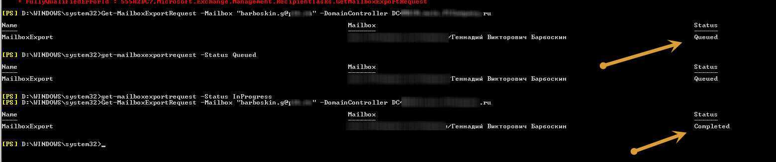 Get-MailboxExportRequest -Mailbox «barboskin.g@pyatilistnik.org» -DomainController DC4.pyatilistnik.org
