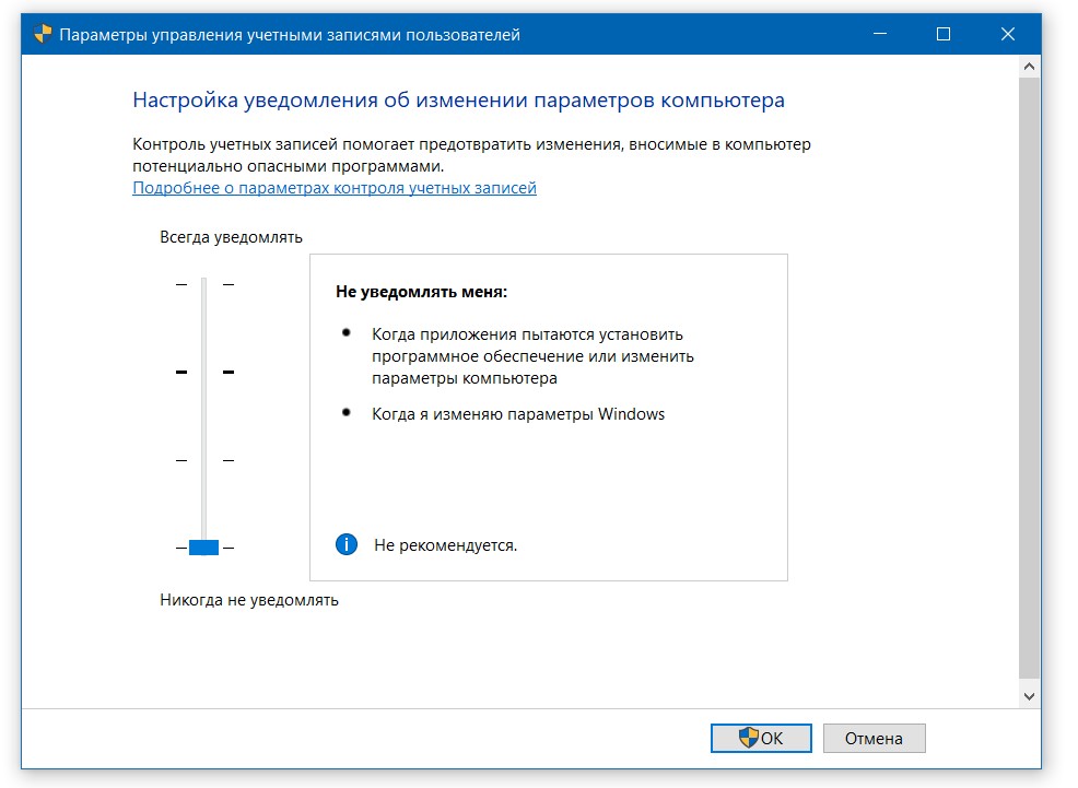 Теперь нам предстоит временно отключить в нашей системе UAC (User Account Control): если мы этого не сделаем, каждая выполняемая HFSLIP операция будет сопровождаться всплывающим системным предупреждением и нам придется нажимать «Да» больше 200 раз. Даже самому терпеливому юзеру это очень быстро надоест. Для отключения UAC в Windows 10 нужно сделать следующее. Открой панель поиска щелчком мыши на кнопке с изображением лупы в панели задач, набери и нажми появившийся значок «Изменение параметров контроля учетных записей». Перемести ползунок вниз в положение «Никогда не уведомлять» и нажми «Оk», затем подтверди это действие в открывшемся окне.