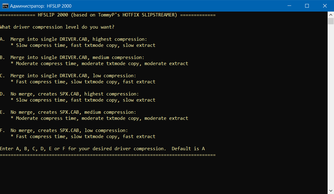 Теперь снова запусти файл в папке HFSLIP с правами администратора. Тебе предложат выбрать, как интегрировать обновления в дистрибутив Windows 2000: добавить компоненты в с разной степенью компрессии либо создать новый архив также с использованием разной степени сжатия. Я предпочел вариант .