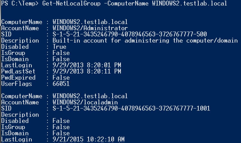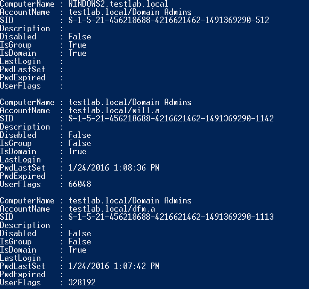For some quick review, Get-NetLocalGroup utilizes the Active Directory Service Interfaces WinNT provider to query the members of a local group (default of ‘Administrators’) from a remote machine. We can pull not just group member names, but whether the member is a group or user, whether the account is disabled, the account’s last login time, the account SID, and more. With the SID we can also determine if the result is a local account/group or a domain account as well. And what’s really cool is that we can query all of this information as an unprivileged domain user context (though you do need a domain authenticated account).